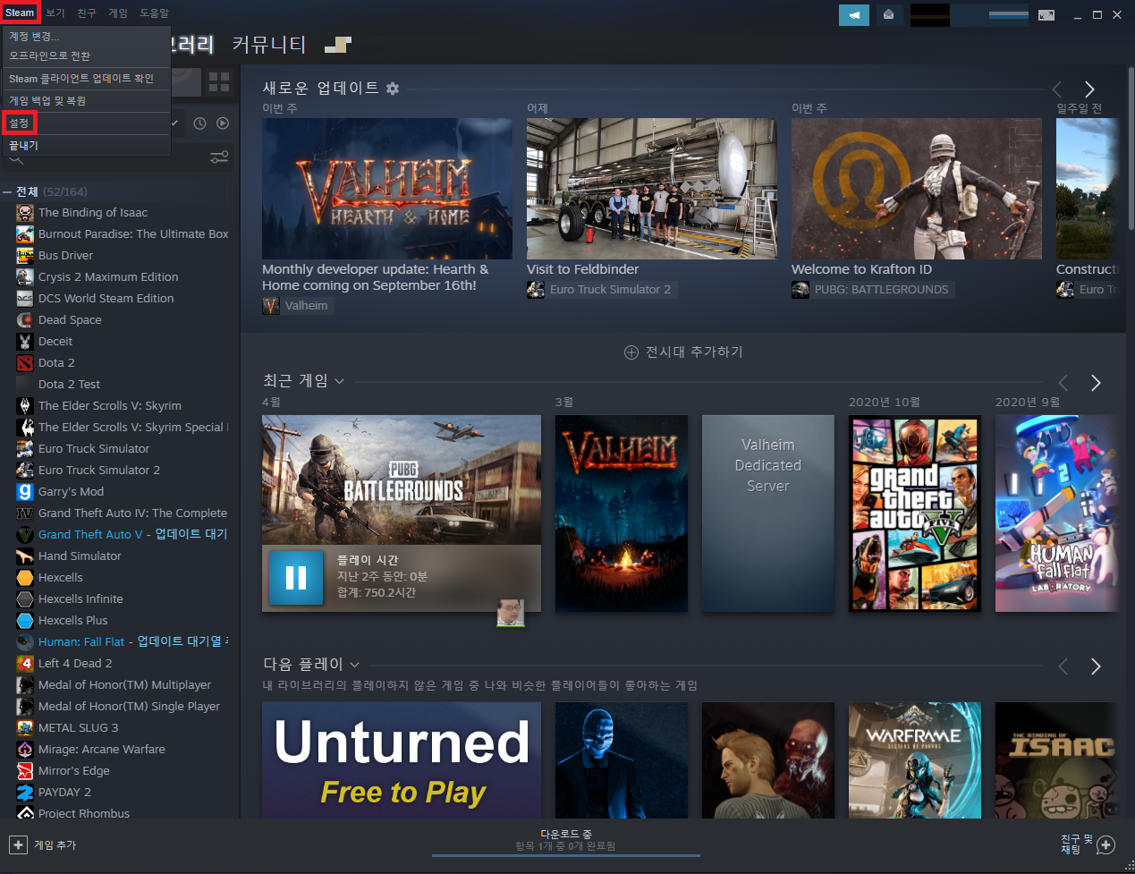 원인을 찾다보니 제가 사용하는 네트워크가 스팀 다운로드 한국 서버와 통신이 원활하지 않는 것 같더라고요