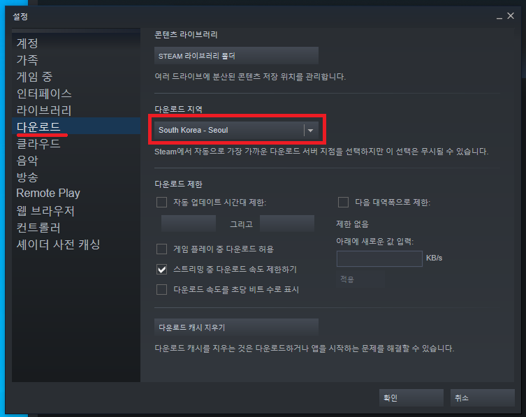 스팀 다운로드 속도 올리기, 스팀 다운로드 서버 국가 변경하기