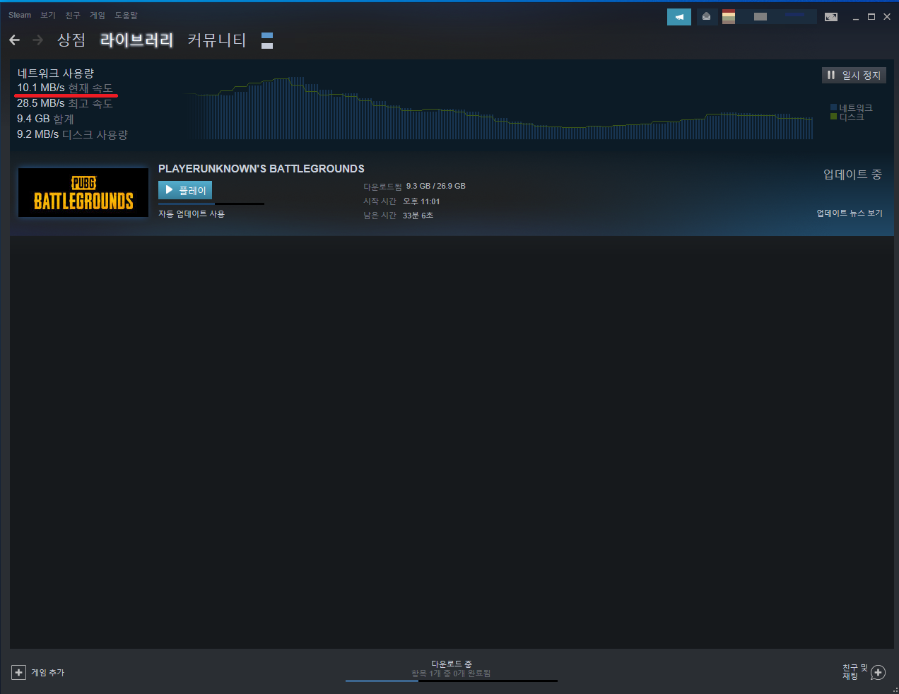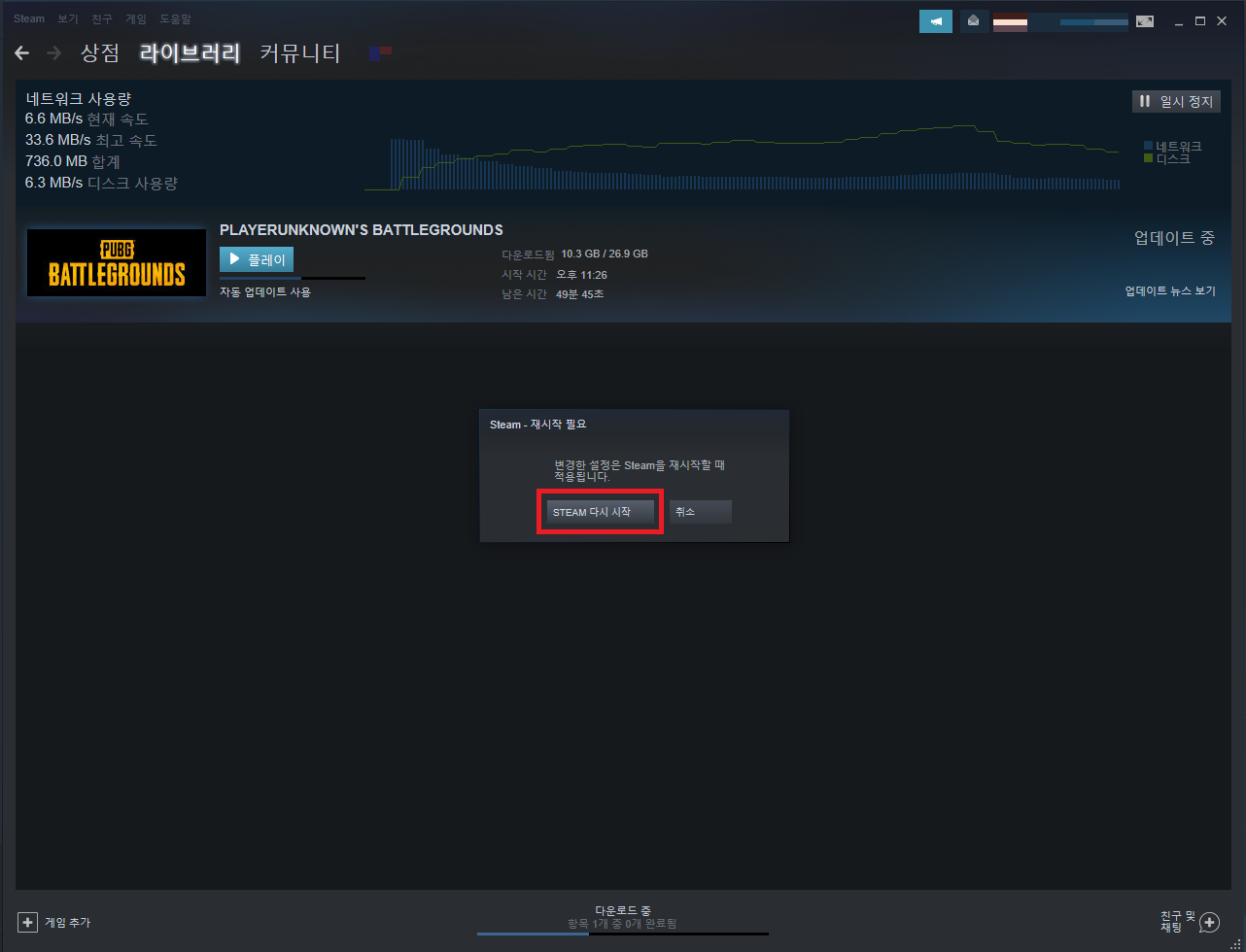 7. Steam이 재시작된 후 다운로드 속도를 체크해줍니다.