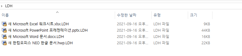 한글, 엑셀, 워드, 파워포인트 파일들이 정상적인 확장자가 아닌 LDH 확장자로 끝나는 파일들이 있습니다.