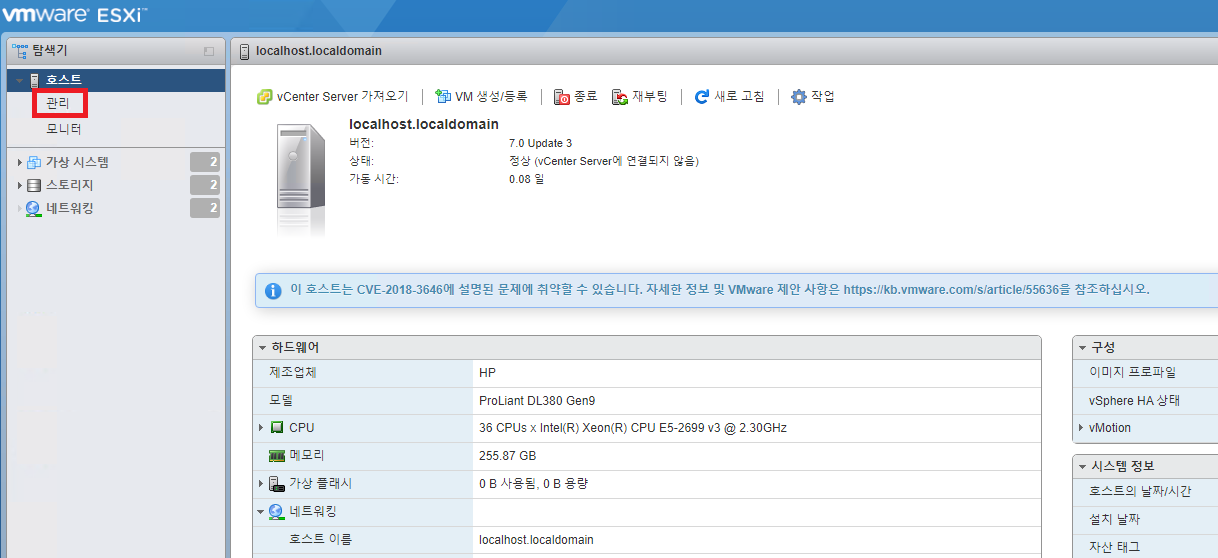 ESXI 호스트 웹 콘솔로 로그인 하시면 위와 같은 페이지가 나옵니다.