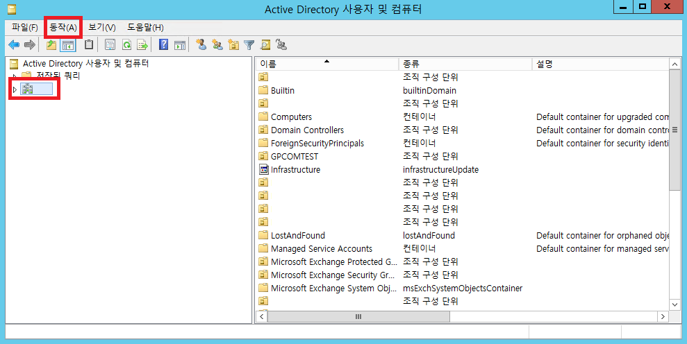 3. 도메인의 루트를 선택하시고 동작 메뉴를 클릭해줍시다.