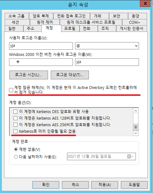 AD 특정 사용자 Kerberos로 미리 인증 받지 않도록 설정하기