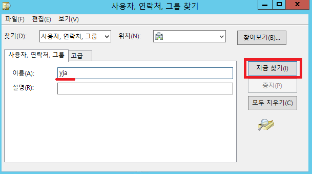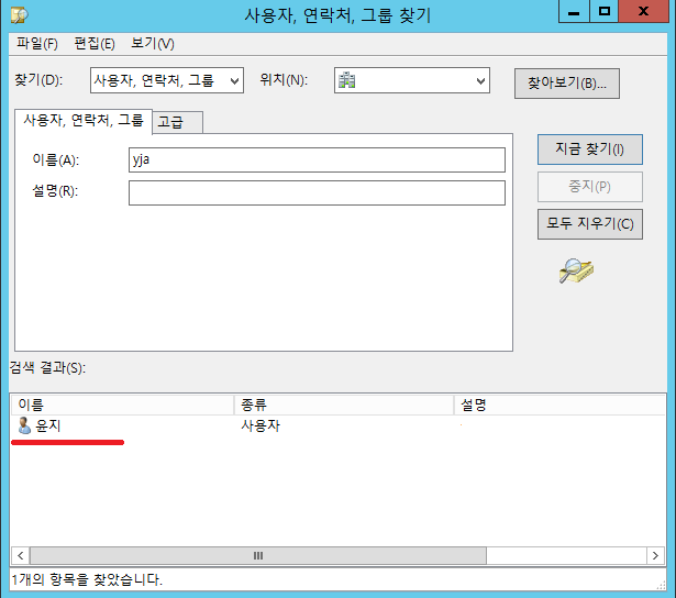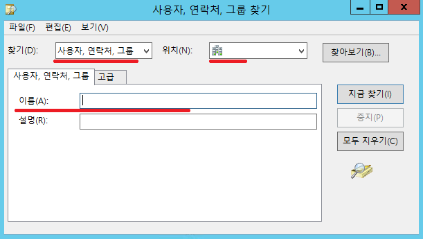 찾기 항목에 사용자, 연락처, 그룹을 위치 항목에 AD 도메인의 루트 항목(최상단)을 선택하시고