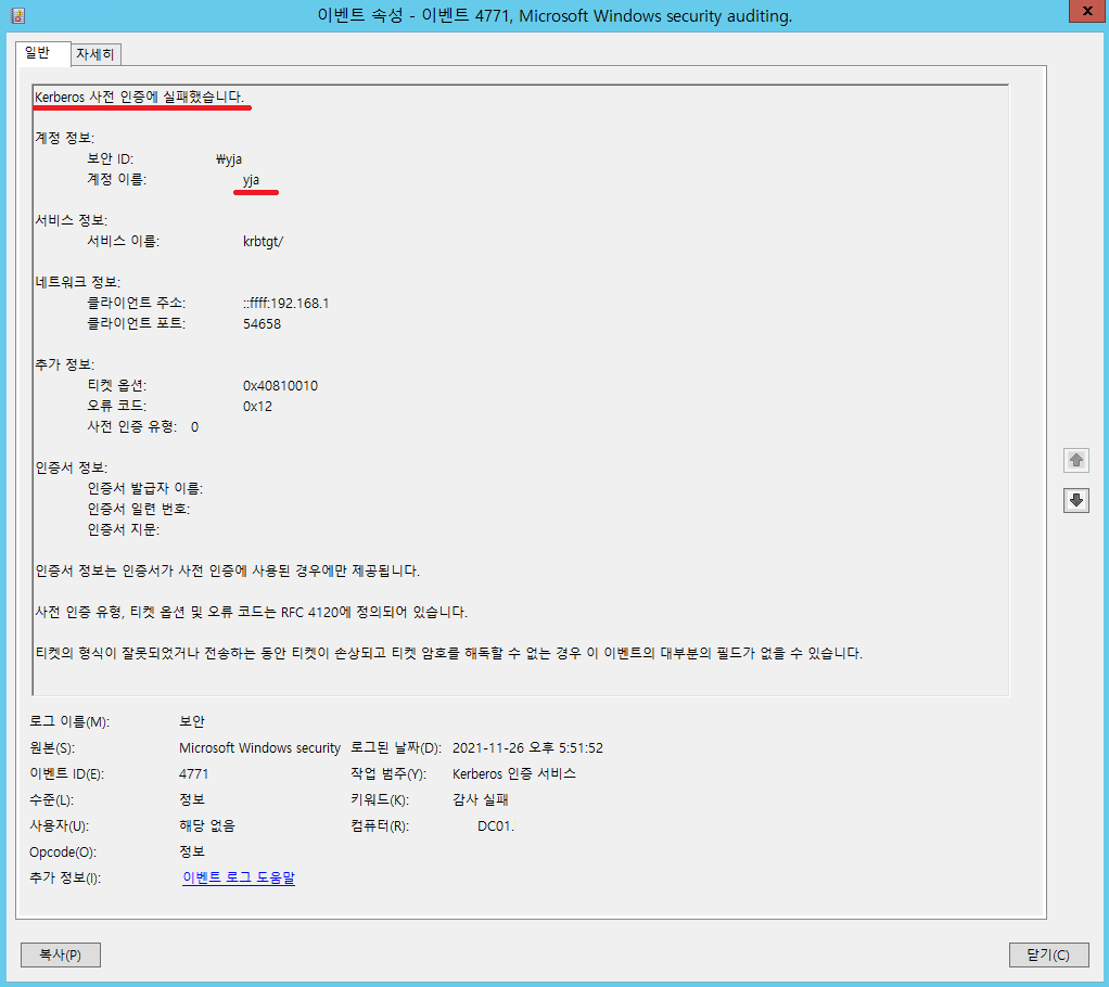 이벤트 4771, Kerberos 사전 인증에 실패했습니다.