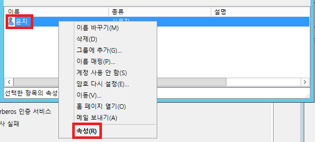8. 해당 사용자를 선택 후 우 클릭을 눌러서 메뉴 탭을 띄우고 속성 버튼을 눌러주세요.