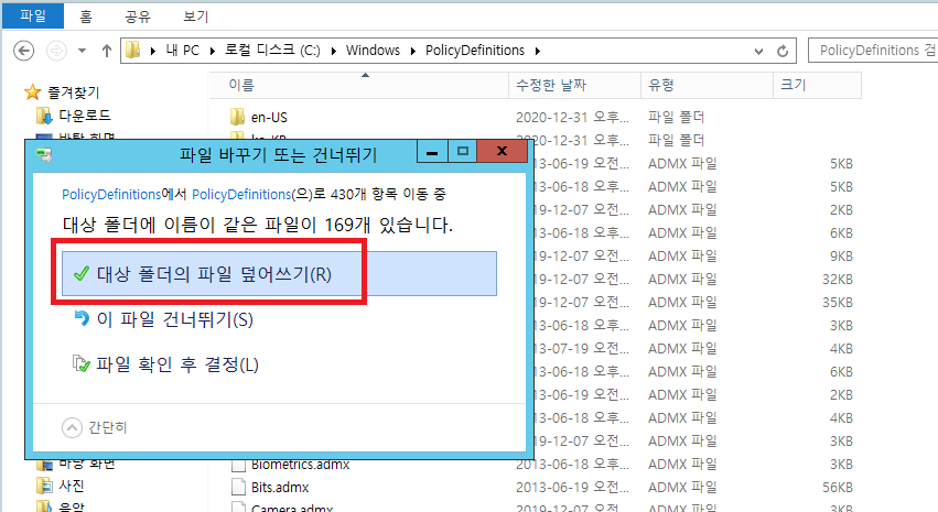 동일하게 en-US와 ko-kr 폴더를 선택 후 C:\Windows\PolicyDefinitions\ 폴더 안으로 옮겨줍니다.