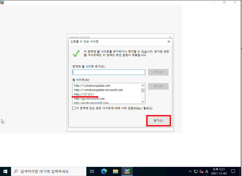 http://127.0.0.1 가 추가되었다면 닫기를 눌러주세요.