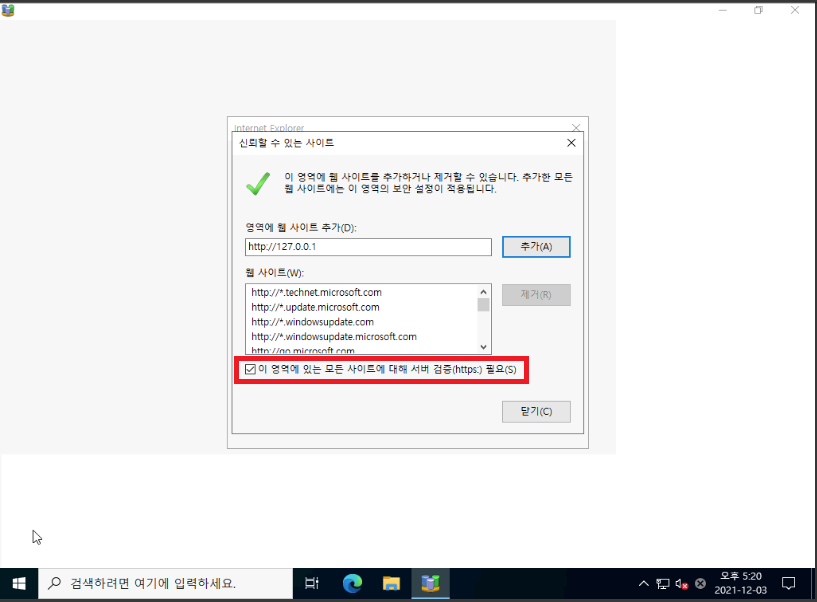 아래 이 영역에 있는 모든 사이트에 대해 서버 검증(https:) 필요(S)의 체크를 해제 해주세요.
