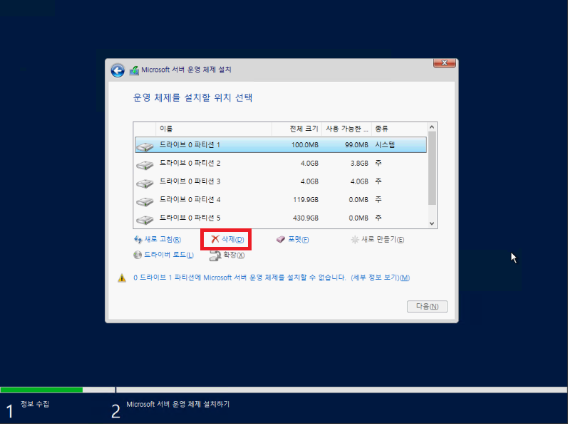 드라이브1은 데이터 공간의 파티션이였으므로 지우지 않고 납두어서 드라이브 1 파티션 1로 표시되고