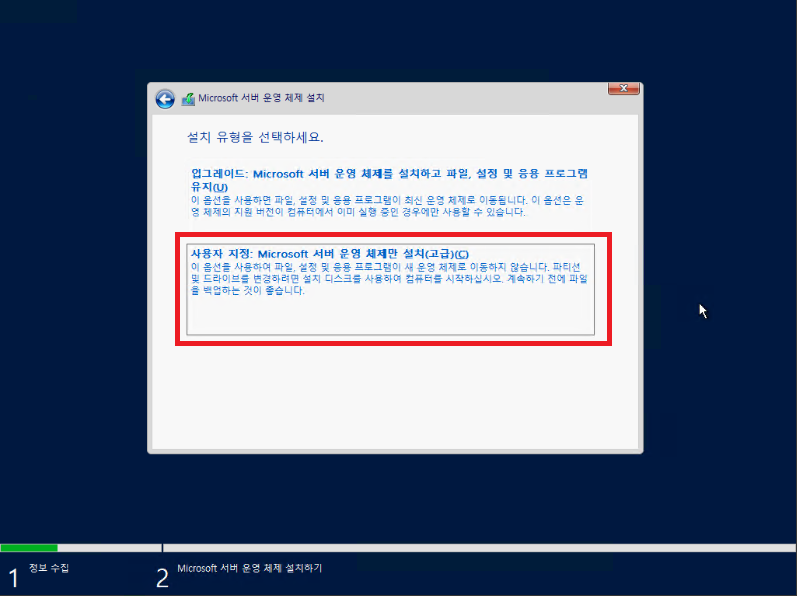 사용자 지정: Microsoft 서버 운영 체제만 설치(고급)(C)를 클릭해줍니다.