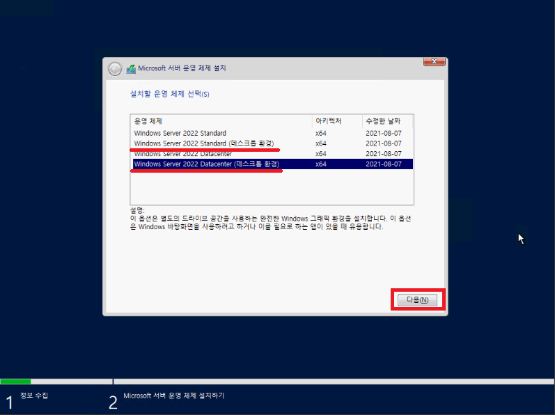 저는 Hyper-v를 이용하기 위해 Datacenter 라이센스를 보유하고 있어서 Datacenter(데스크톱 환경)을 선택해주었습니다.