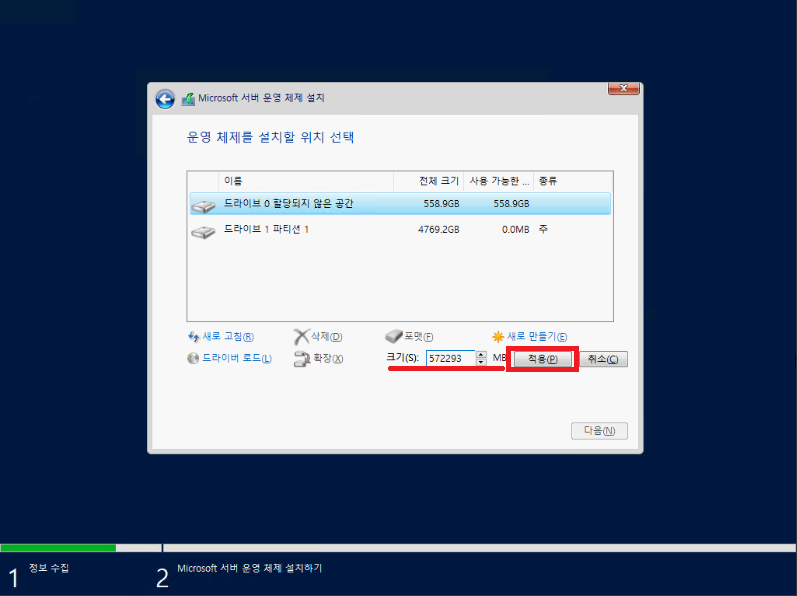 저는 OS 공간을 모두 잡을 것이므로 기본값으로 두고 적용을 누르겠습니다.