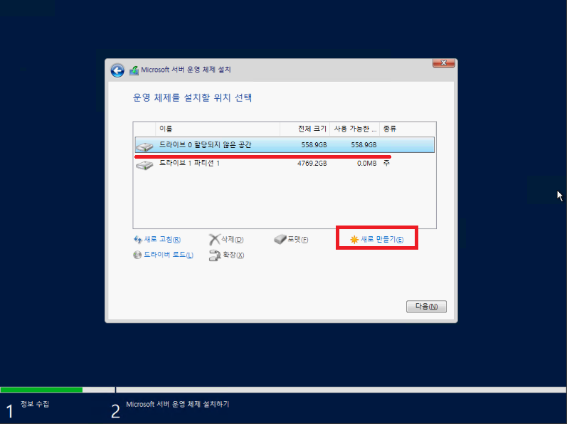 드라이브0을 선택하시고 새로 만들기를 클릭해줍시다.