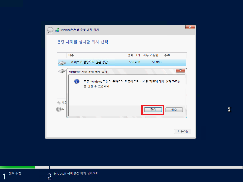 13. 파티션 생성 시 시스템 파일 전용 파티션이 별도로 생성된다는 메시지입니다.