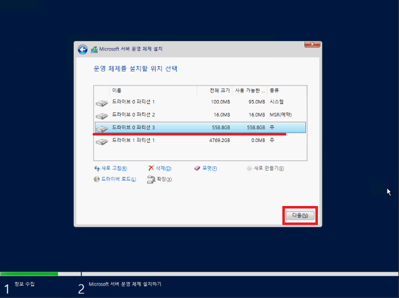 종류가 주로 되어있는 파티션을 선택하고 다음을 눌러줍시다.