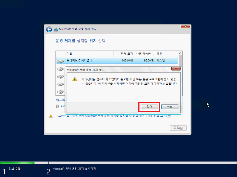 드라이브1은 데이터 공간의 파티션이였으므로 지우지 않고 납두어서 드라이브 1 파티션 1로 표시되고