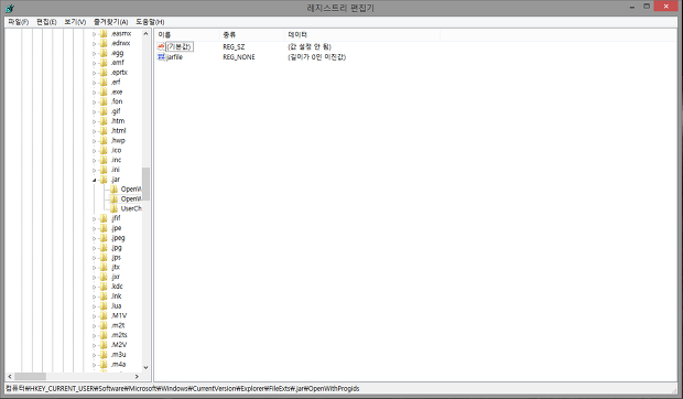 HKEY_CURRENT_USER > Software > Microsoft > Windows > CurrentVersion > Explorer > FileExts > .jar > OpenWithProgids 를 찾아서 들어갑니다.