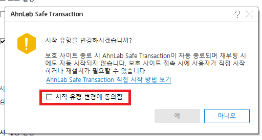 5. AhnLab Safe Transaction 환경설정 창이 뜨셨다면 시작 유형을 선택해줍시다.