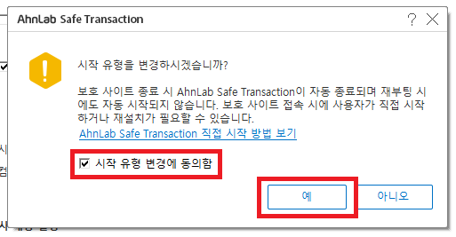 8. 시작 유형 변경에 동의함에 체크하시고 예를 클릭해주세요.