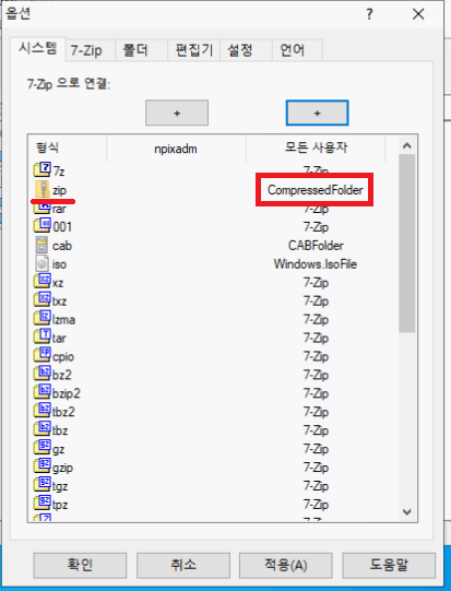 Zip 같은 경우는 이미 윈도우 탐색기에 연결되어있으므로 해당 확장자도 7-Zip에 연결해줍시다.