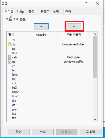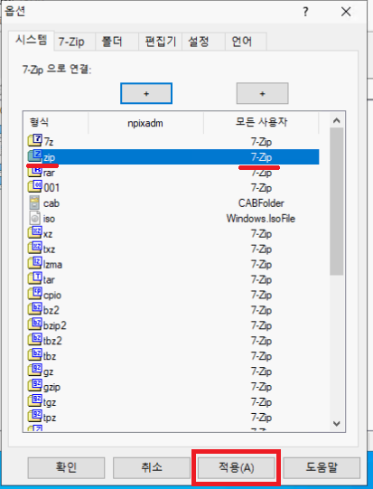 Zip 같은 경우는 이미 윈도우 탐색기에 연결되어있으므로 해당 확장자도 7-Zip에 연결해줍시다.