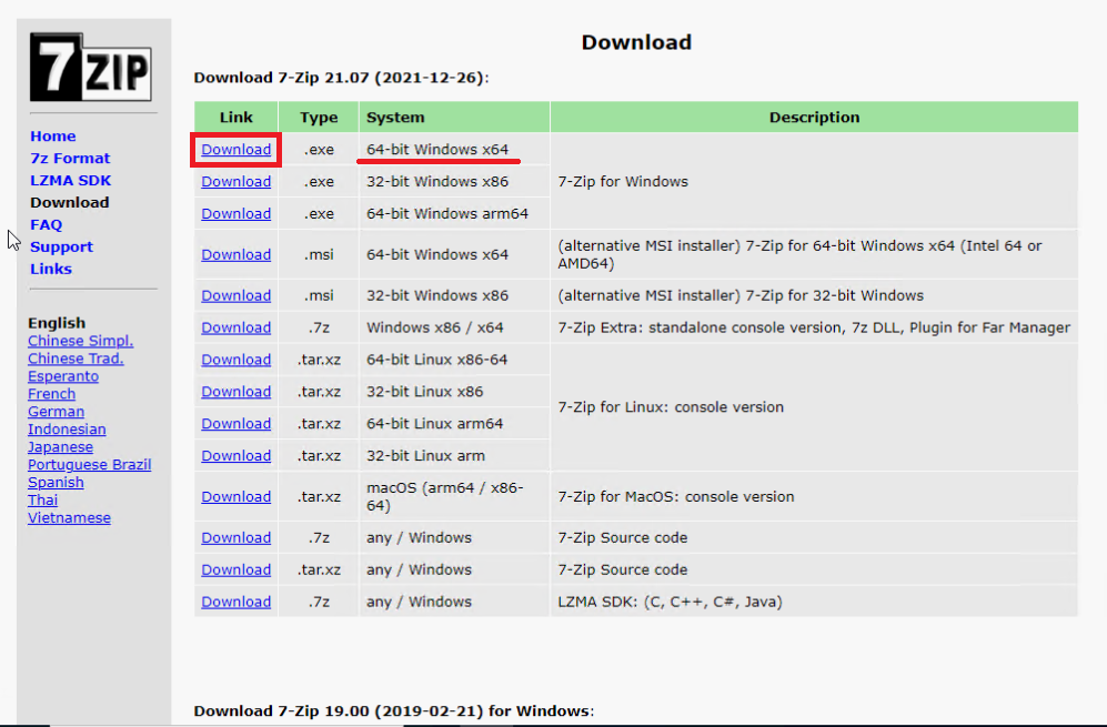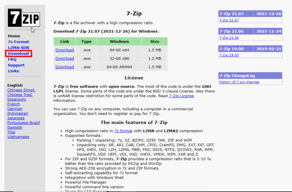 7-Zip 7-Zip is a file archiver with a high compression ratio. Download 7-Zip 21.07 (2021-12-26) for Windows: Link Type Windows Size Download .exe 64-bit x64 1.5 MB Download .exe 32-bit x86 1.2 MB Download .exe 64-bit ARM64 1.5 MB License 7-Zip is free soft