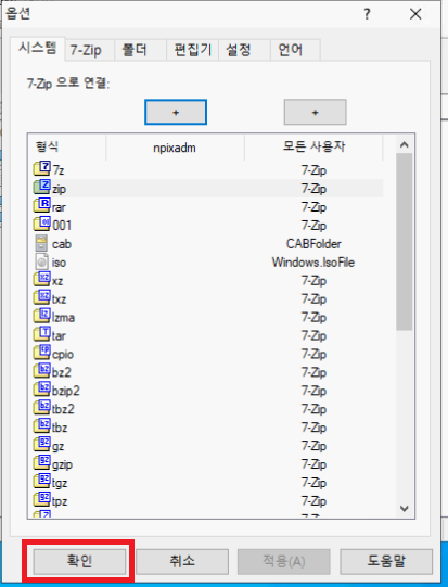 12. 별도의 프로그램에 연결되지 않은 확장자들이 모두 7-Zip에 연결되었습니다.
