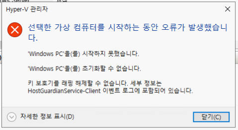 Hyper-V 가상머신 실행 시 키 보호기를 래핑 해제할 수 없습니다. 문제 해결
