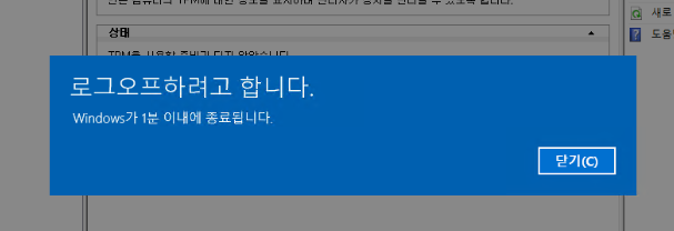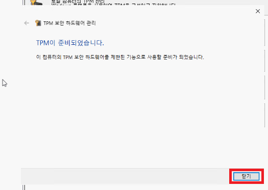 4. 위와 같은 창이 뜨면서 TPM이 준비되었습니다가 뜨면 닫기를 눌러줍시다.