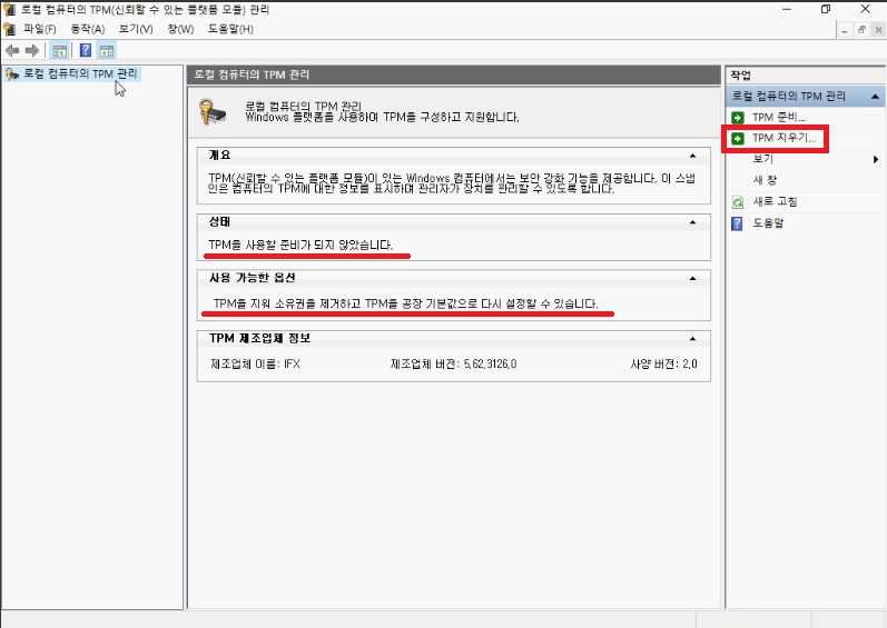 오른쪽 작업 메뉴 탭에서 TPM 지우기를 클릭해줍시다.