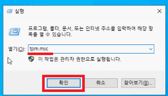 9. tpm.msc 를 입력하고 확인 버튼을 눌러줍시다.