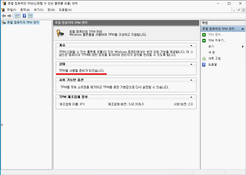 그래서 혹시 TPM 모듈이 현재 정상적으로 작동하지 않나 싶어서 확인해보니