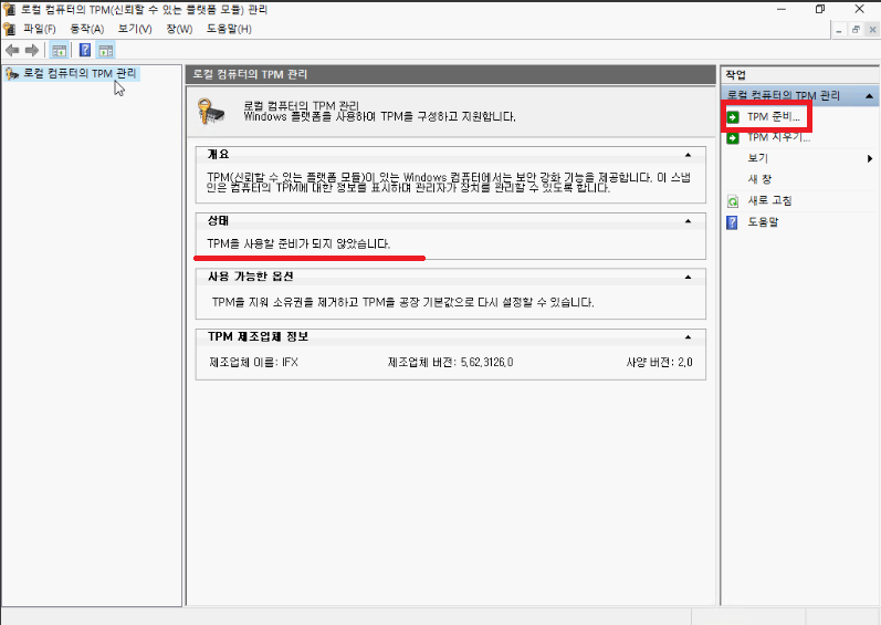 오른쪽 작업 메뉴탭에서 TPM 준비를 클릭해줍시다.
