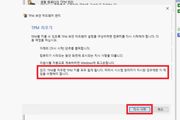6. TPM 지우기 창이 뜨면 다시 시작을 해야만 TPM이 지워지니 다시 시작을 눌러줍시다. (컴퓨터 재부팅됨)