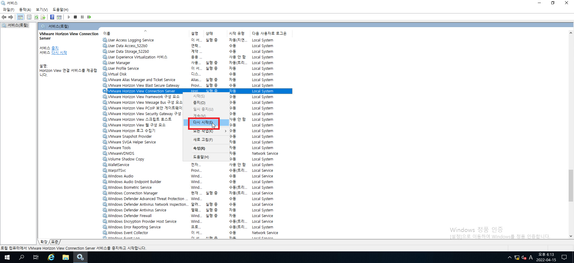 30. 서비스 리스트 중 VMWARE Horizon View Connection Server 또는 VMWARE Horizon View 연결 서버 항목을 찾아줍시다.