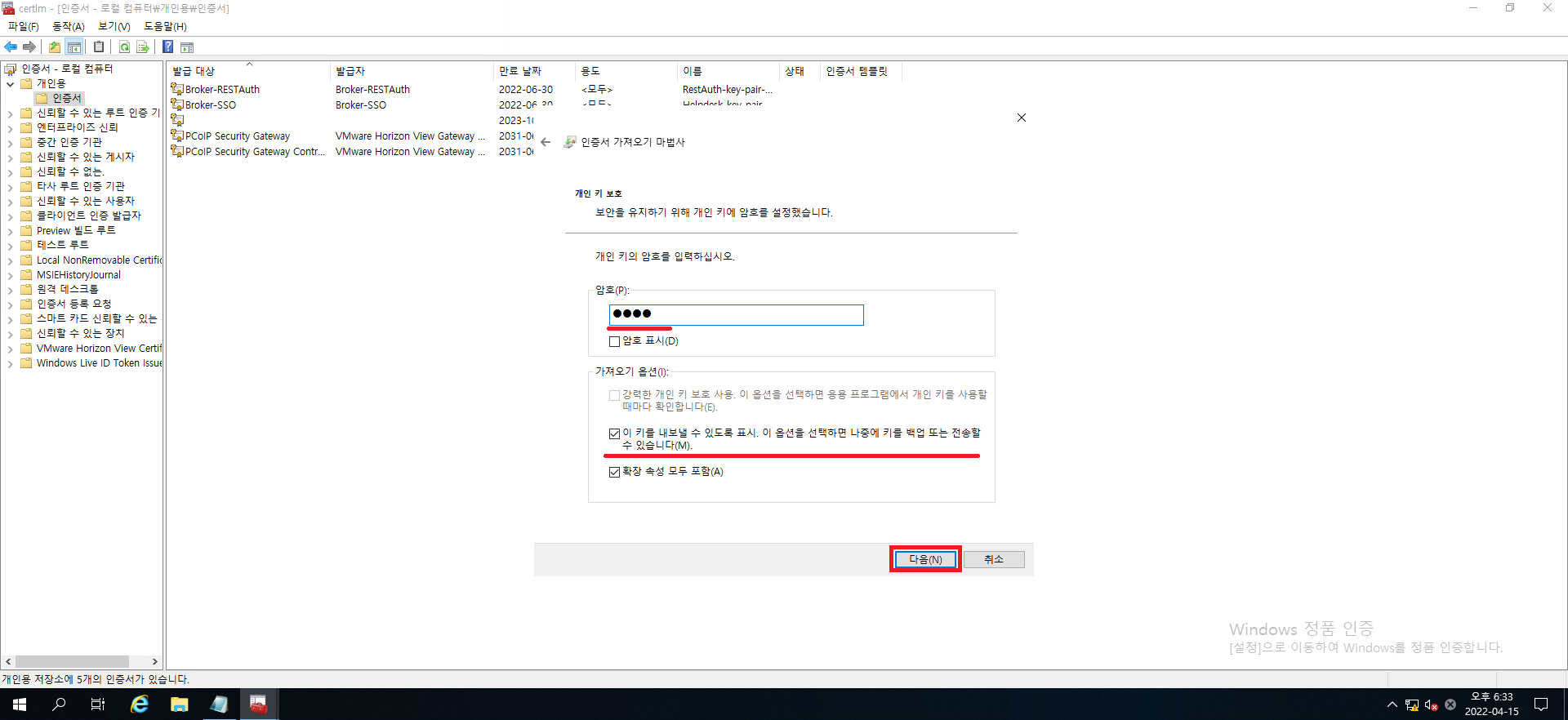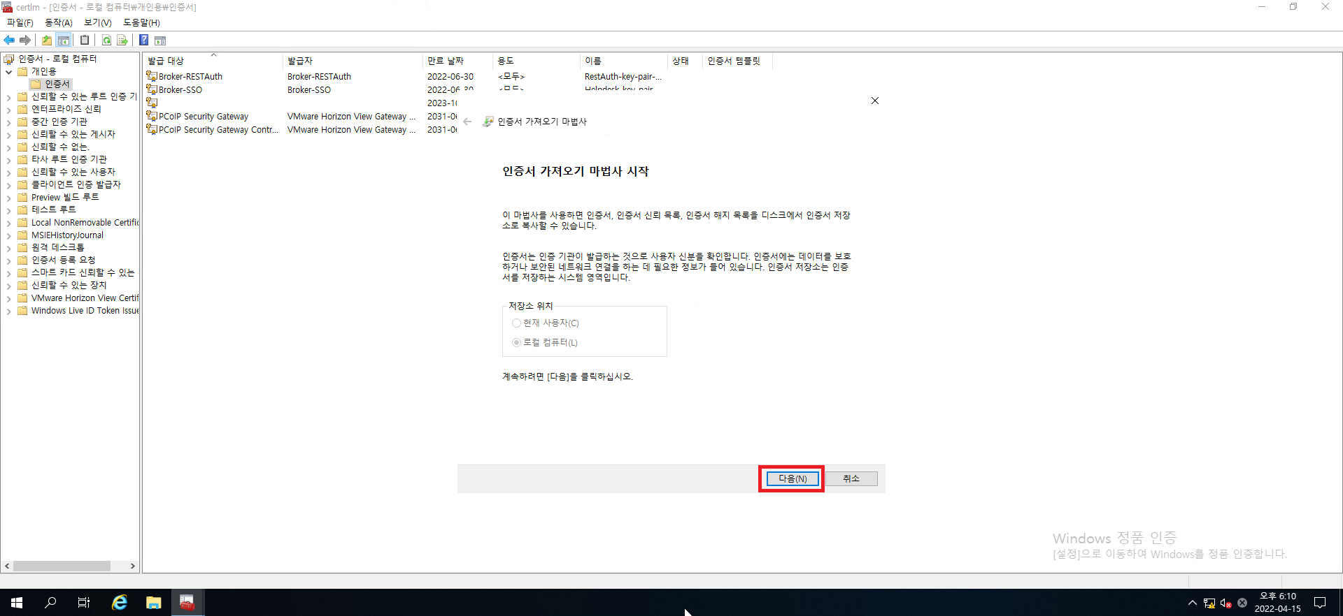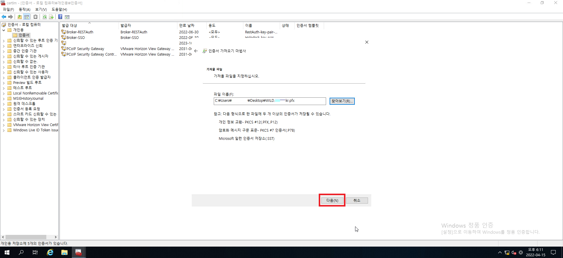 다음을 눌러서 인증서 가져오기를 진행합시다.