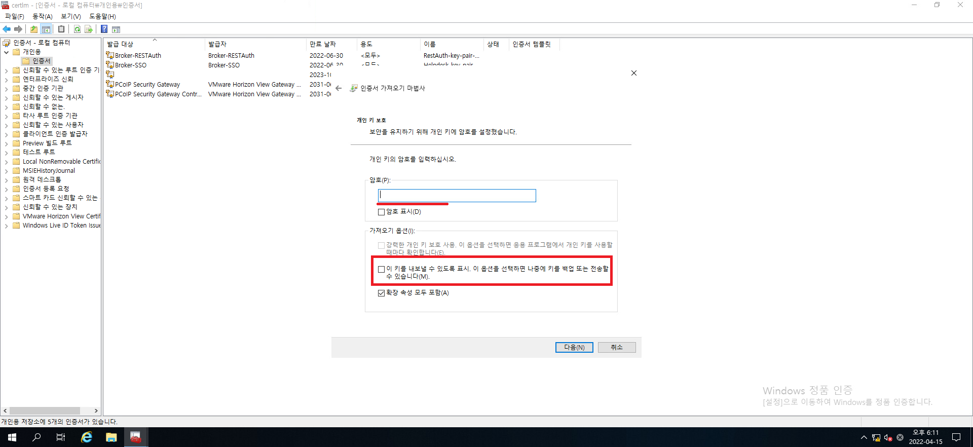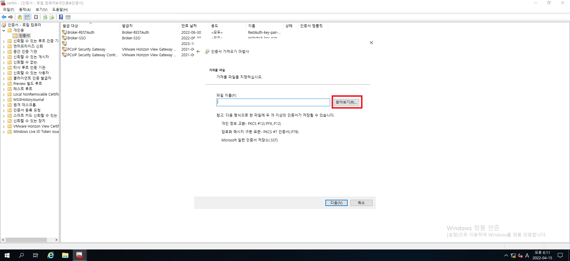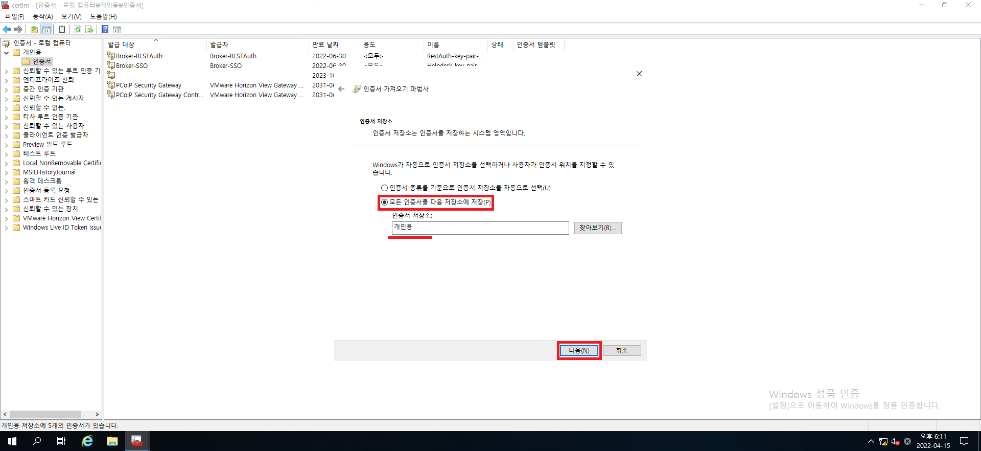 다음을 눌러서 인증서 가져오기를 진행합시다.