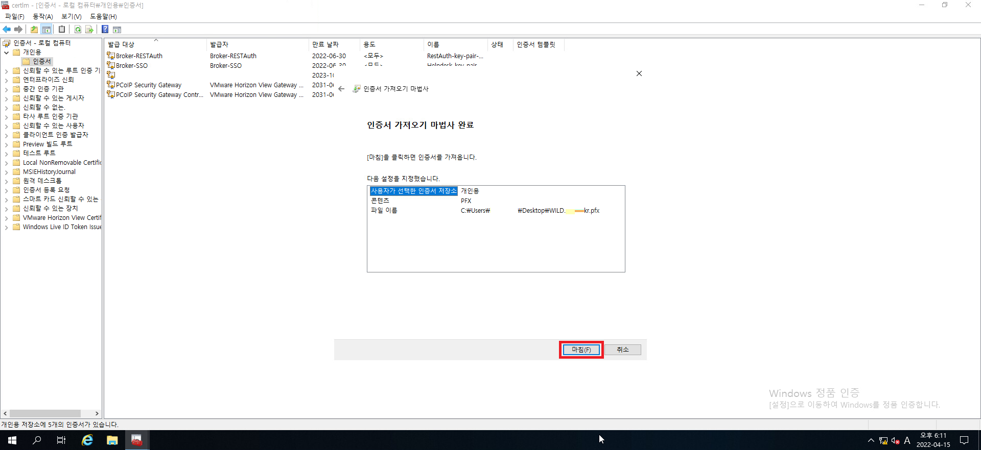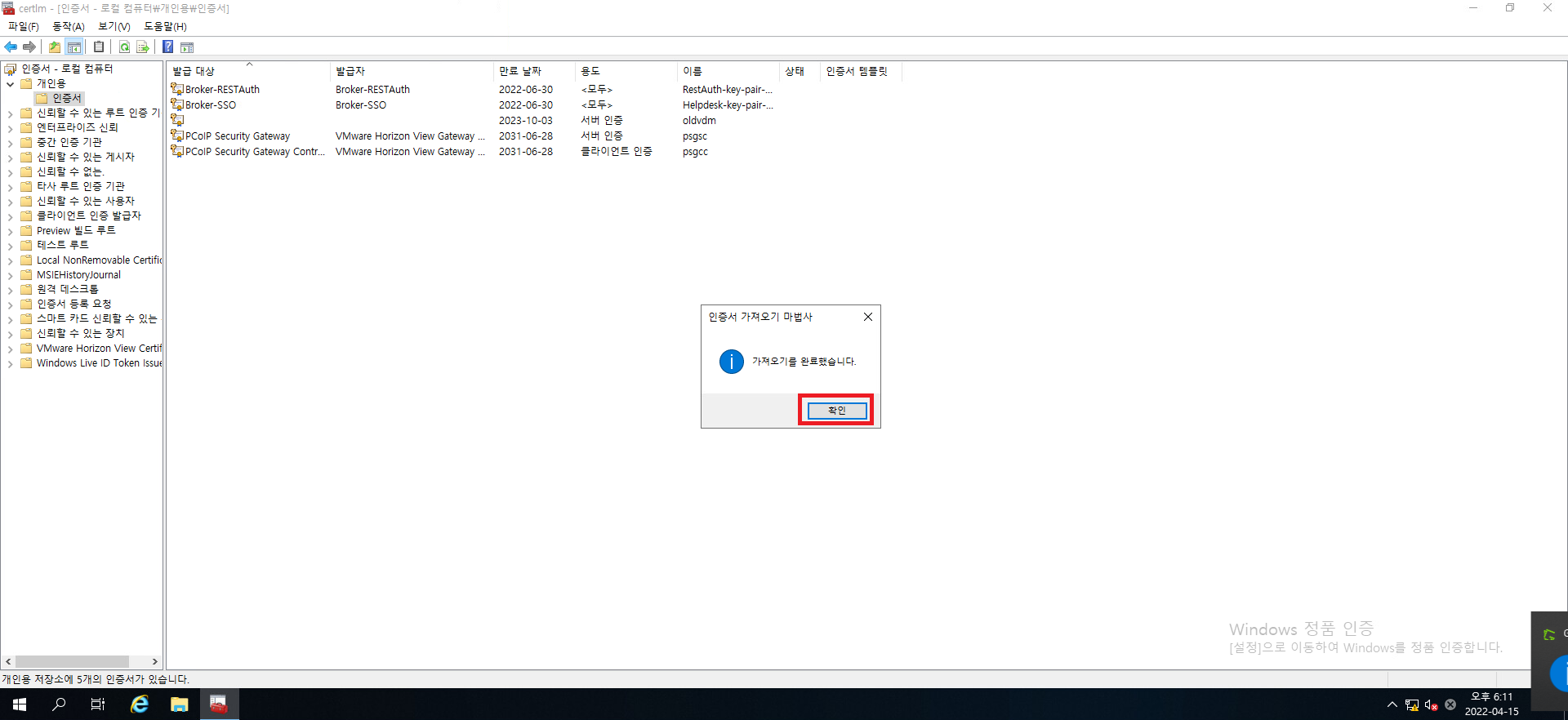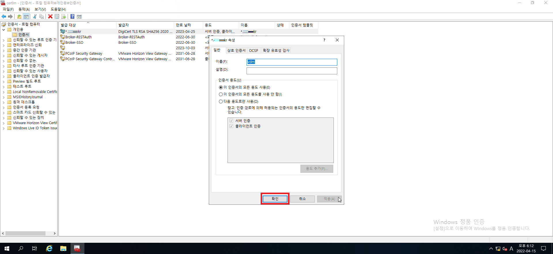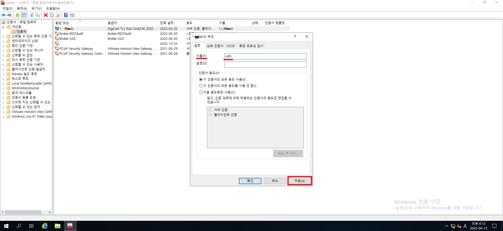 25. 인증서의 명칭이 vdm으로 정상적으로 바뀌었는지 확인하시고 정상적으로 바뀌었다면 인증서 관리 콘솔을 닫아줍시다.