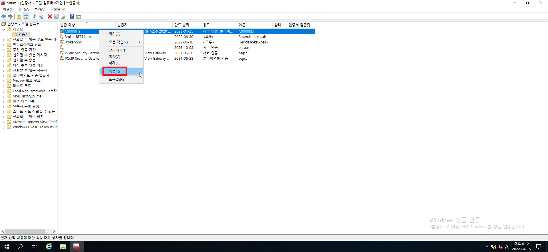21. 추가된 인증서를 우클릭 하고 속성 메뉴로 들어가줍시다.