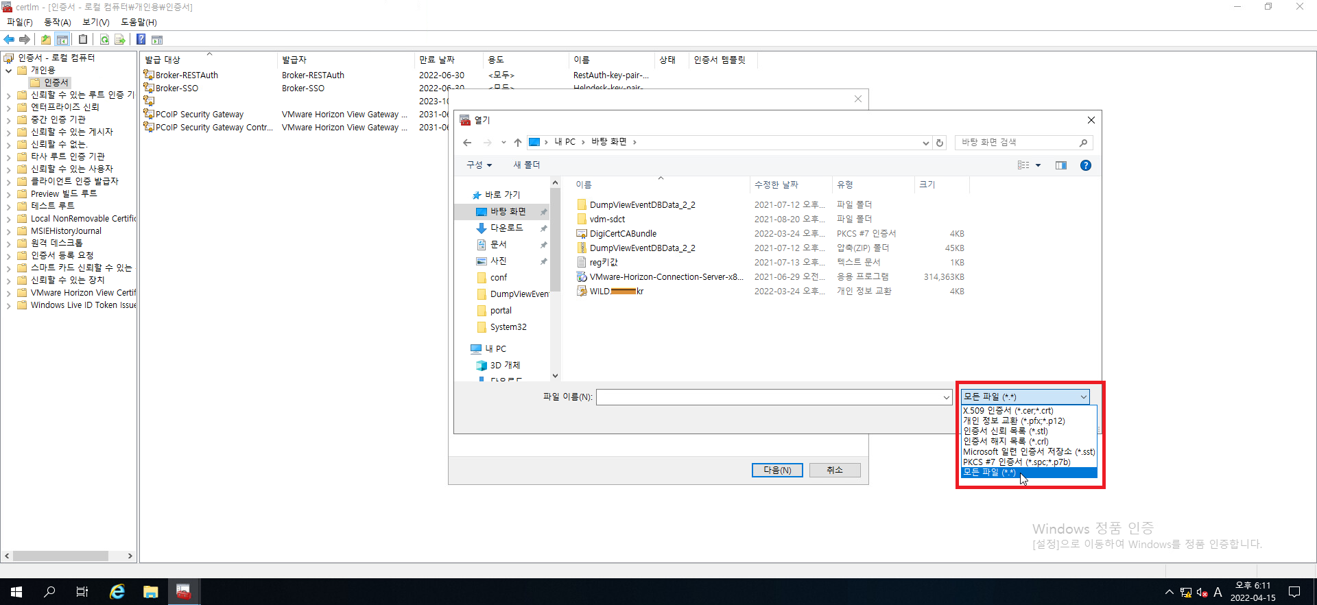 현재는 파일 형식이 *.cer, *.crt 되어 있어서 파일이 안보이는데