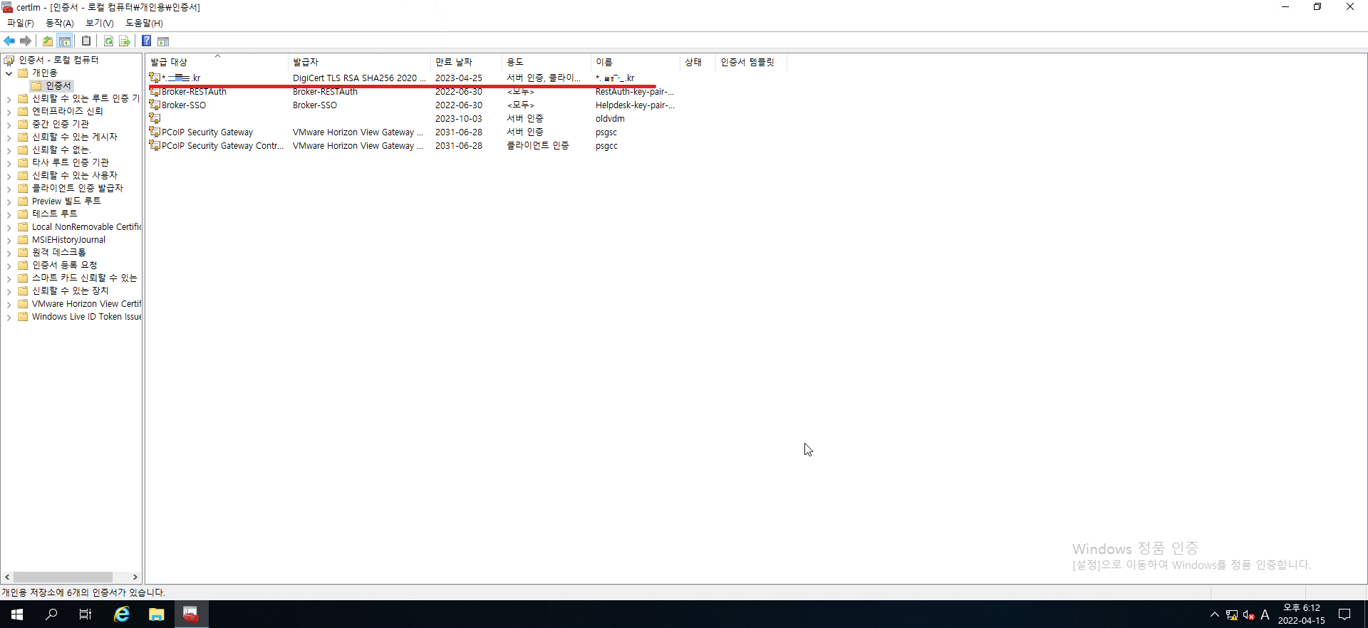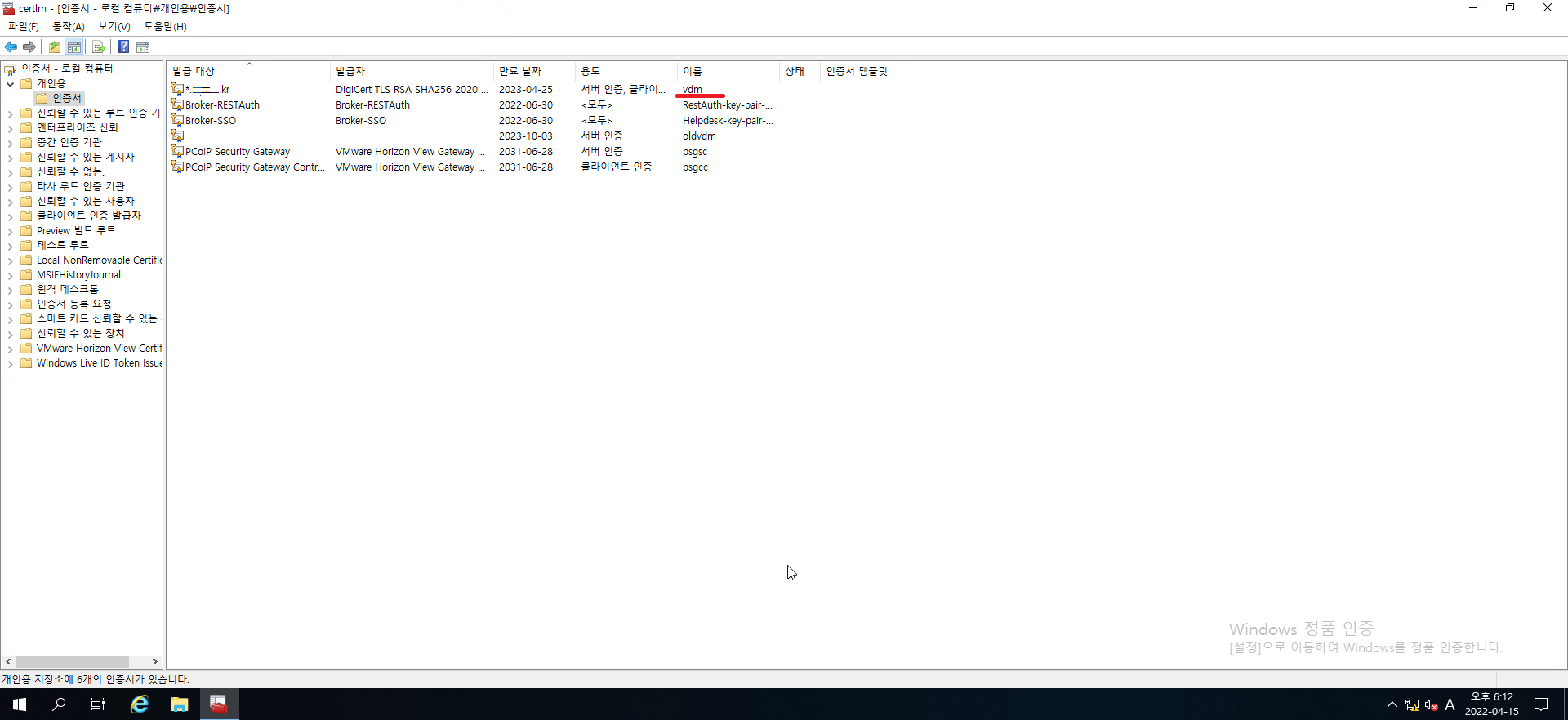 5. 인증서 이름 중 vdm 이라는 이름을 가진 인증서를 찾아줍시다.