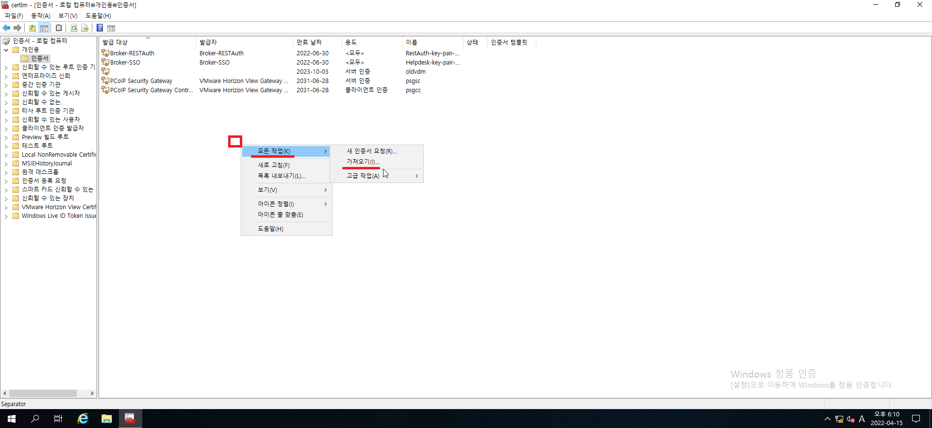 8. vdm 인증서가 삭제되었다면 빈공간에 우클릭하셔서 모든 작업 > 가져오기를 클릭해줍시다.