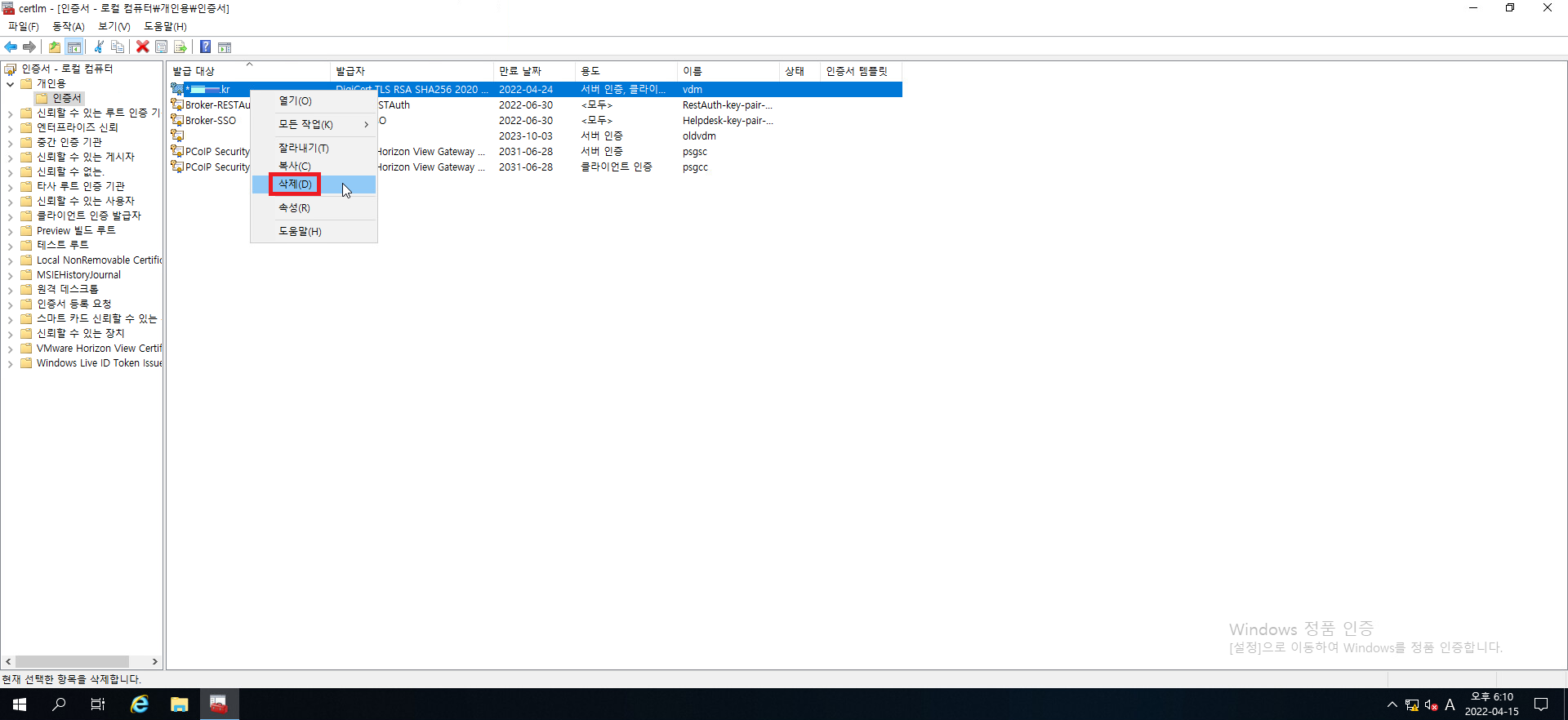 6. vdm 인증서를 우클릭 한 후 삭제 해줍시다.