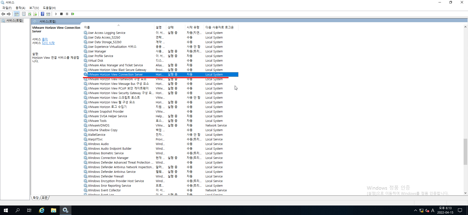 30. 서비스 리스트 중 VMWARE Horizon View Connection Server 또는 VMWARE Horizon View 연결 서버 항목을 찾아줍시다.