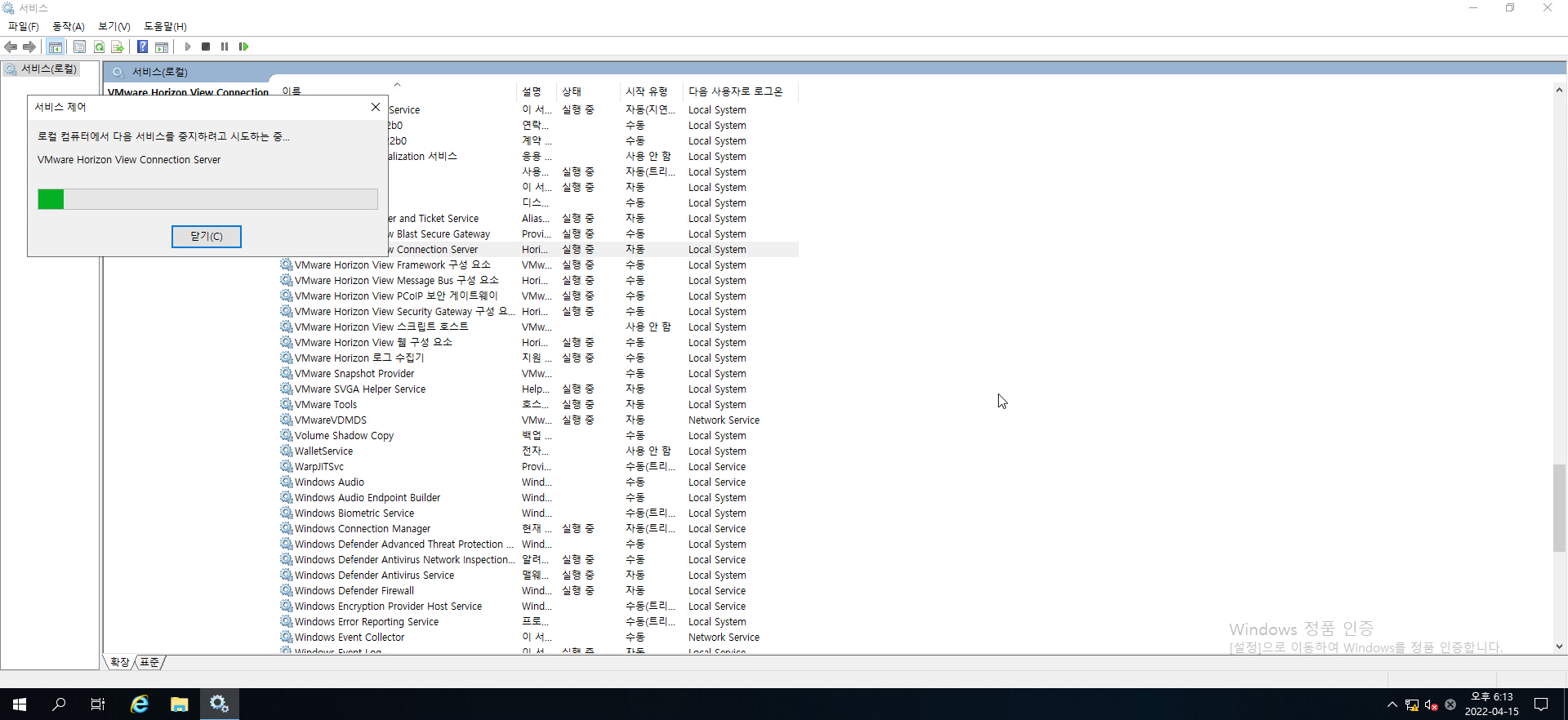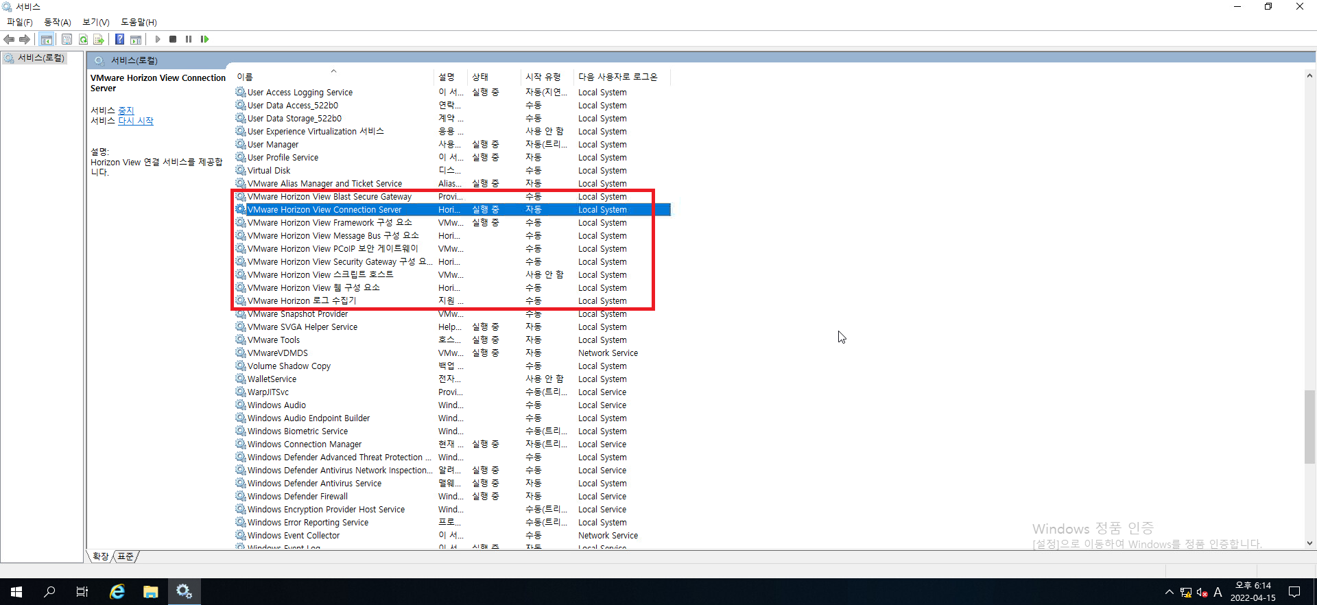 VMWARE Horizon View 라고 시작하는 서비스 중 시작 유형이 사용 안함으로 되어있는 항목 1개를 제외한 나머지의
