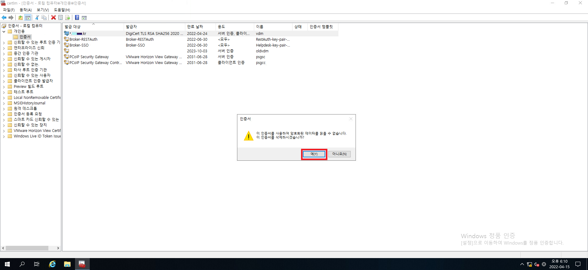 7. 인증서 삭제 시 경고 문구가 뜹니다. 예를 눌러서 삭제해줍시다.