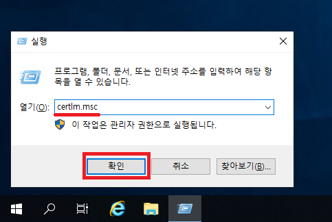 3. certlm.msc 을 입력한 후 확인을 눌러줍시다.