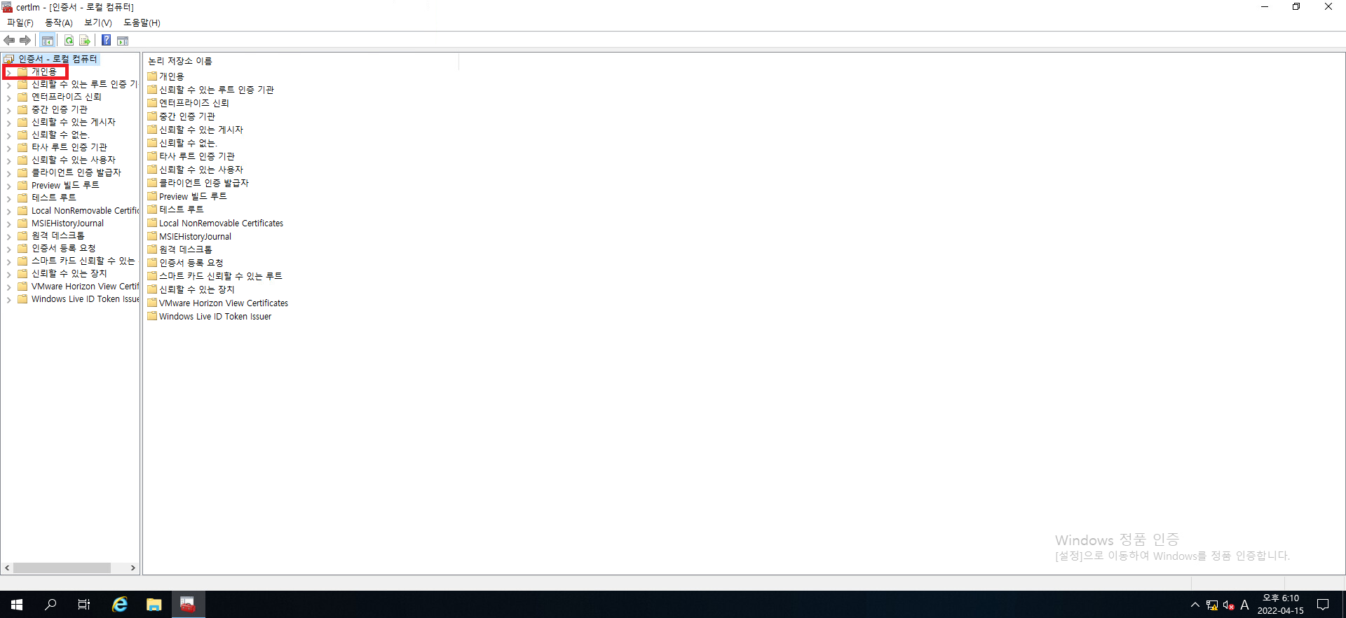 4. 위와 같이 certlm 인증서 - 로컬 컴퓨터 관리창이 뜨셨다면