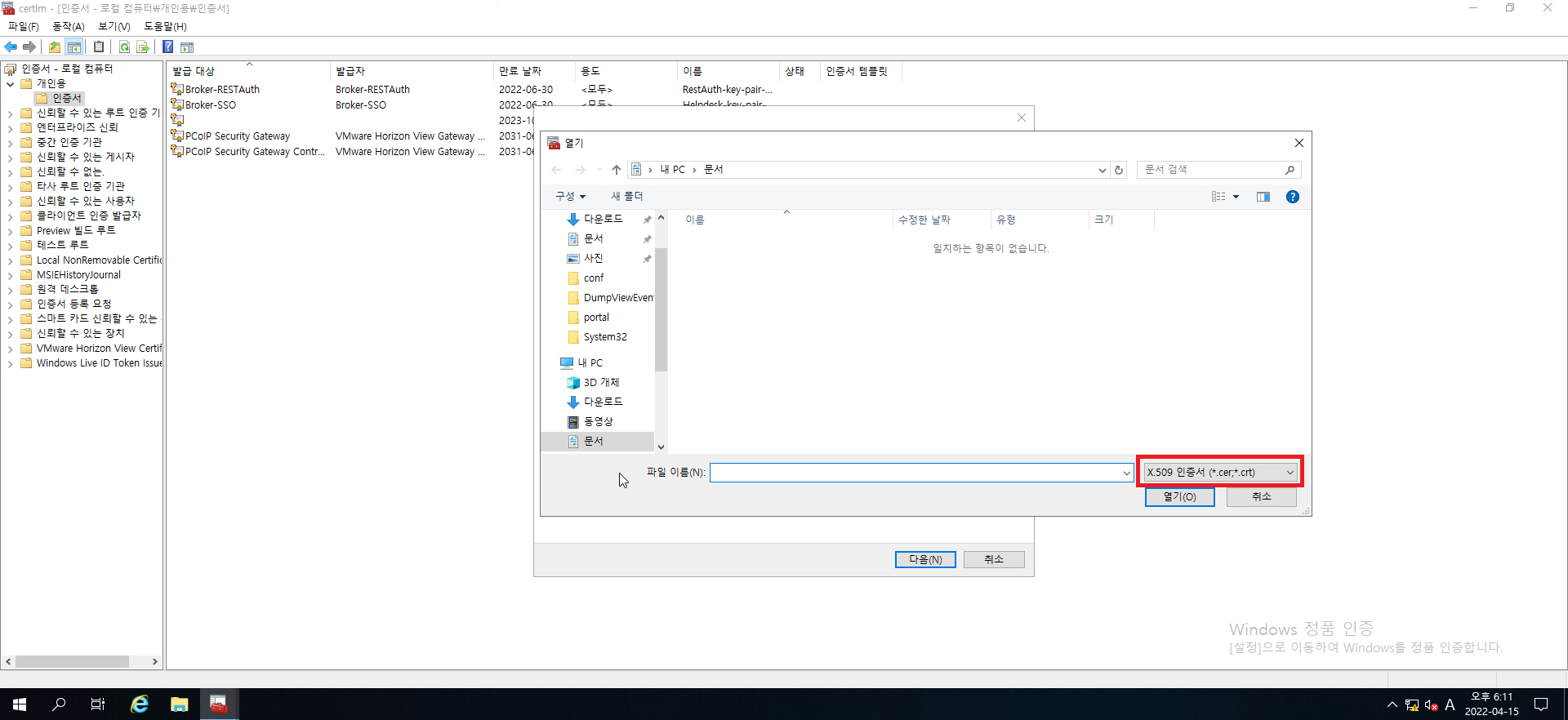 11. 열기 창이 뜨면 인증서가 있는 위치로 이동하고